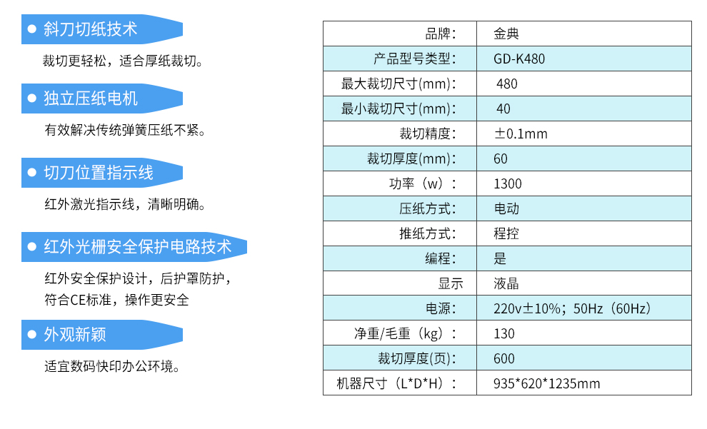 照片容量: 金典 操作方式: GD-K480 最大塑封厚度(mm): 60mm(600頁) 輸入電壓(V): 電動 輸入電流: 程控 預熱時間: 支持 機器尺寸(mm): 數(shù)碼顯示 凈重/毛重(kg): 220v±10% 過塑溫度: 1300w 膠輥數(shù)量: 130/135kg 膠輥直徑: 935×620×1235mm 輸入功率(W): ±0.1mm 最大塑封尺寸(mm): 480mm 毛重(kg): 電動程控切紙機 凈重(kg): 40mm