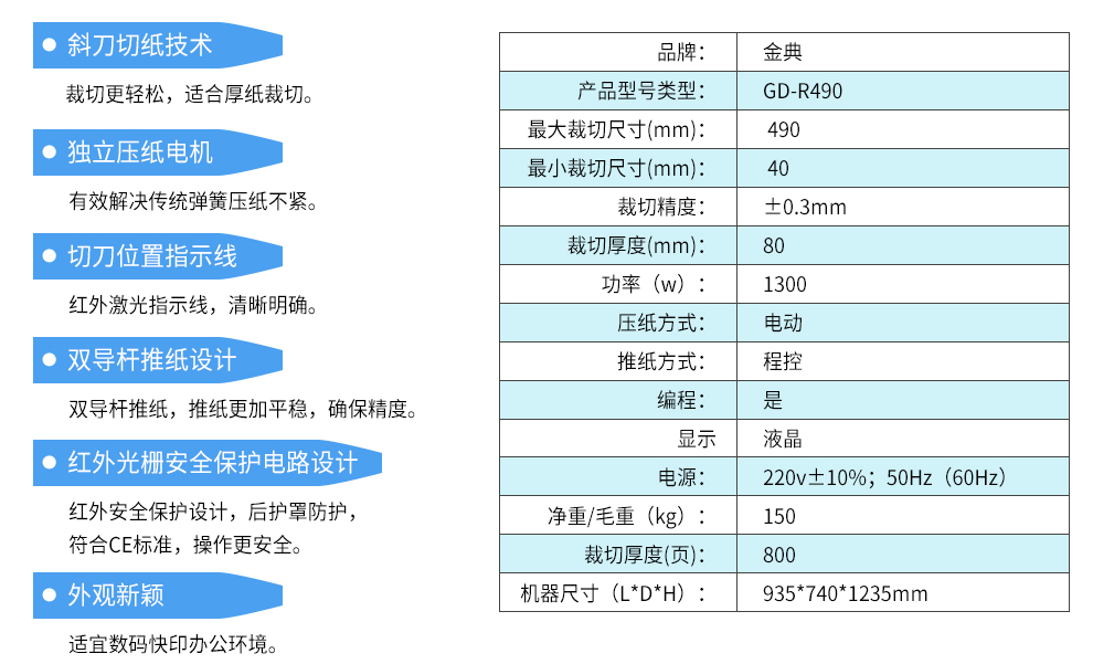 照片容量: 金典 操作方式: GD-R490 最大塑封尺寸(mm): 490mm 最大塑封厚度(mm): 80mm(800頁) 輸入功率(W): ±0.3mm 輸入電壓(V): 電動 輸入電流: 程控 預熱時間: 支持 機器尺寸(mm): 液晶顯示 凈重/毛重(kg): 220v±10% 過塑溫度: 1400w 膠輥直徑: 935×740×1235mm 膠輥數(shù)量: 150/190kg 過塑寬度: 950×750×1250mm 毛重(kg): 電動程控切紙機 凈重(kg): 40mm
