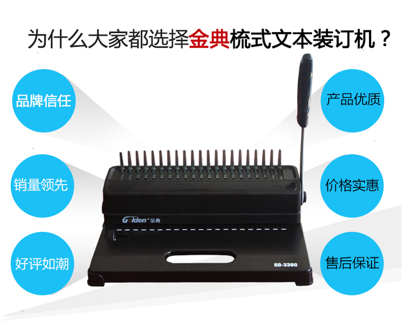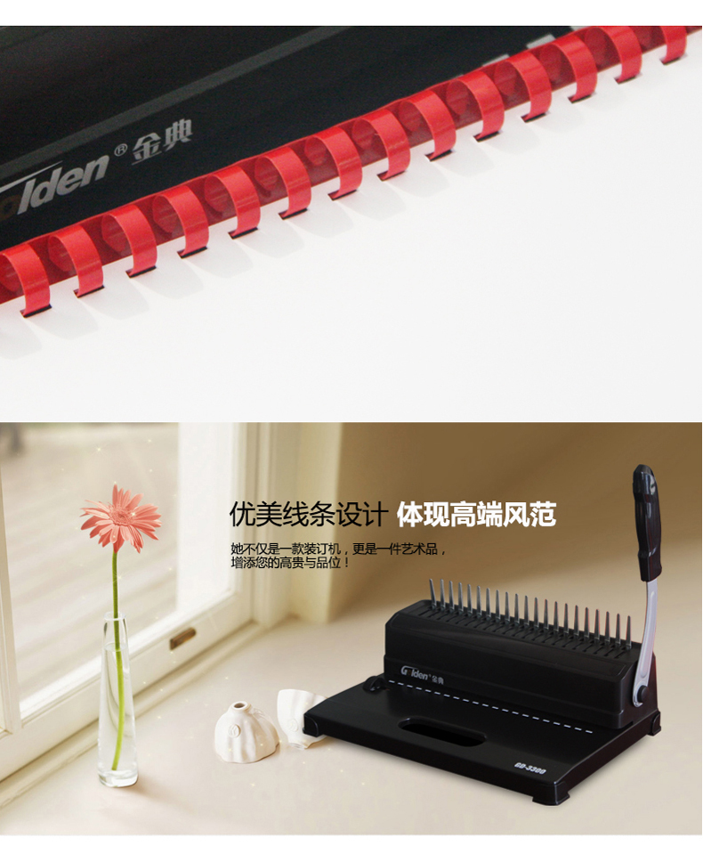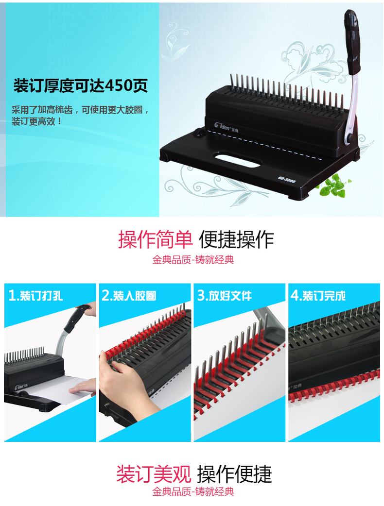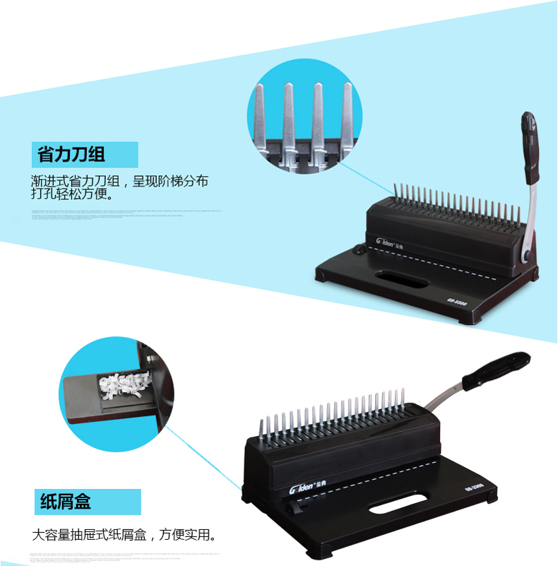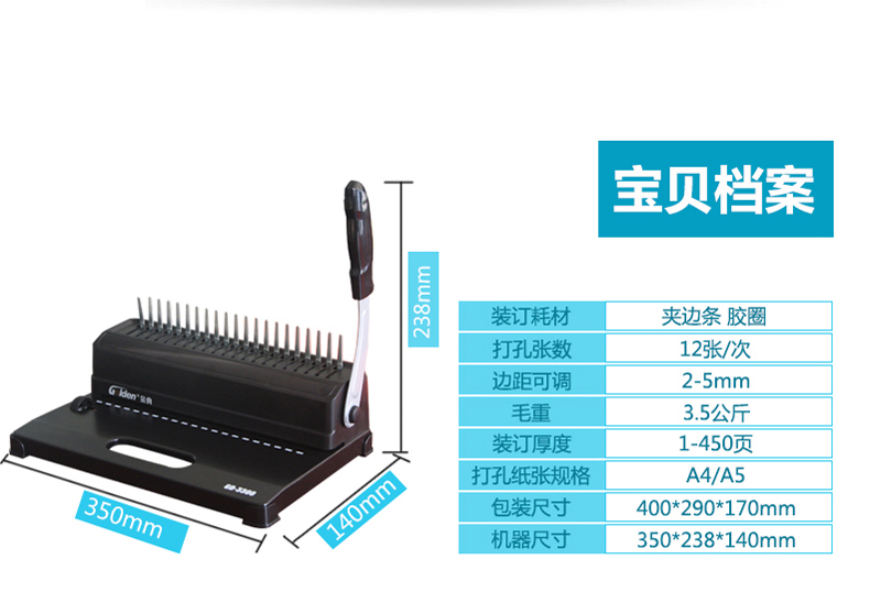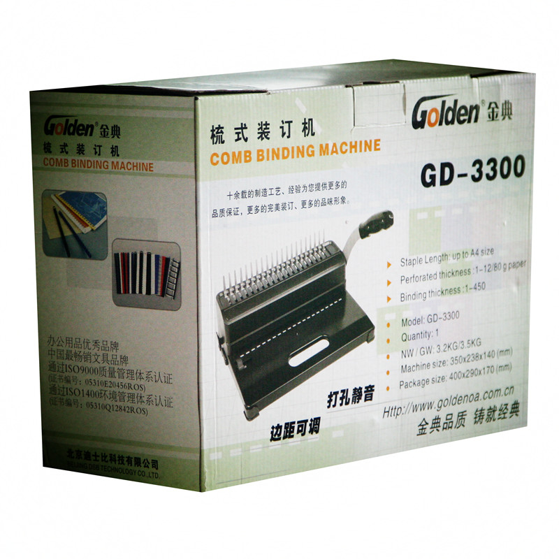 膠裝速度: 金典 預熱時間: GD-3300 壓本寬度(mm): 梳式裝訂機 重量(kg): 1-10頁(70g) 設備類型: 裝訂膠圈 工作長度(mm): 手動 工作寬度(mm): 手動 工作厚度(mm): 1-250頁 外觀尺寸(mm): 297mm(A4) 紙板厚度(mm): 4/5kg 書脊厚度(mm): 367×250×150mm 槽寬設置: 407×295×173mm
