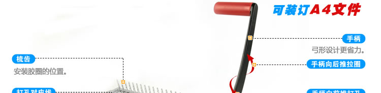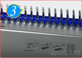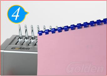把膠圈套在梳齒上,用手柄向后推,將膠圈撐到合適的位置,將打好孔的文本套在膠圈上。