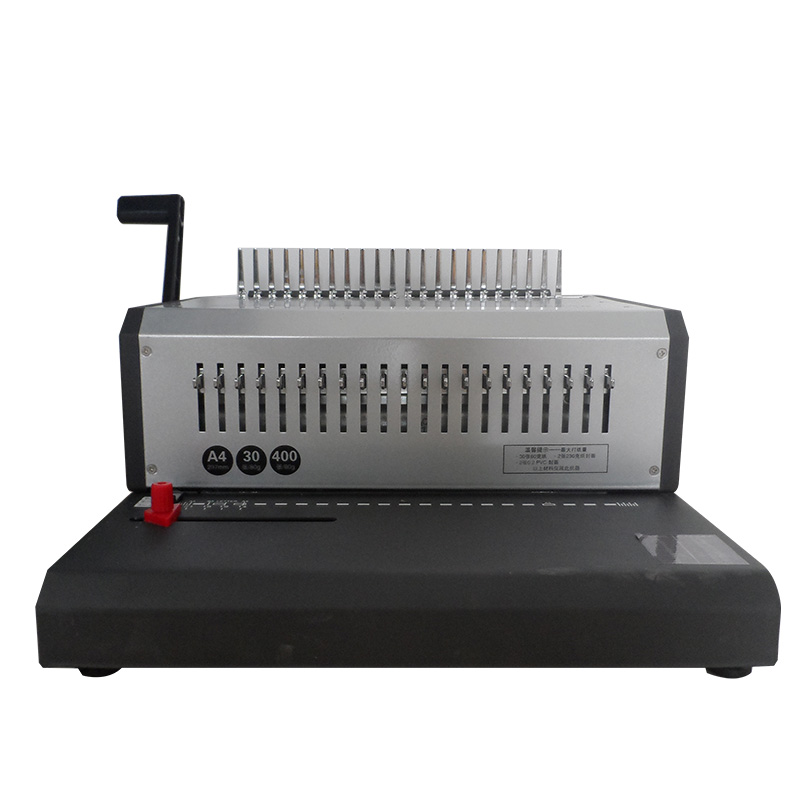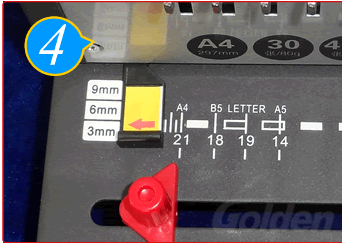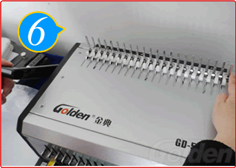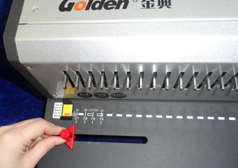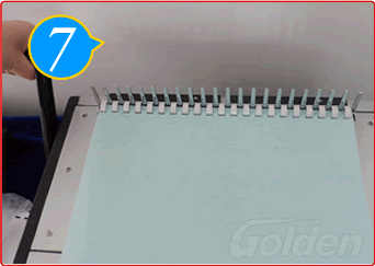 讓紙張孔全部插進(jìn)膠圈齒后,將手柄往上拉直到拉到位,收緊膠圈口。