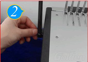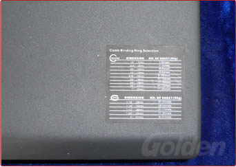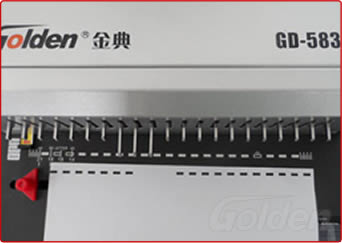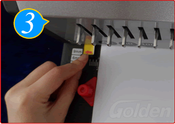 根據(jù)紙張數(shù)量,選擇大小不同規(guī)格的膠圈,將手柄慢慢地往下拉至膠圈打開,然后將紙張孔插入膠圈內(nèi)。