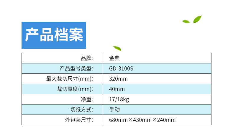 照片容量: 金典 操作方式: GD-3100S 最大塑封尺寸(mm): 320mm 最大塑封厚度(mm): 40mm(400頁(yè)) 輸入功率(W): ±1mm 輸入電壓(V): 手動(dòng) 輸入電流: 手動(dòng) 預(yù)熱時(shí)間: 不支持 機(jī)器尺寸(mm): 刻度標(biāo)尺 膠輥數(shù)量: 17/18kg 過(guò)塑寬度: 680×430×240mm 毛重(kg): 桌面式切紙機(jī)